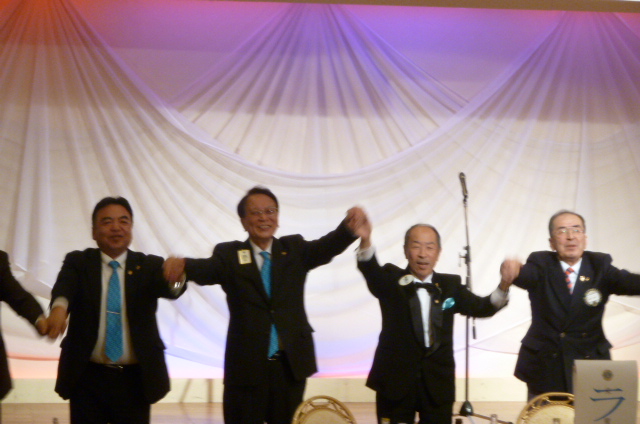 | 乾杯。ラッキーカード抽選会では感謝の意を込め、全員に景品がいきわたるようにし、大いに盛り上がった。 大会実行委員長賞(華の湯ペア宿泊券)が当たったLは大喜び! 皆様からのドネーションは『142,943円』となり、社会福祉目的に使用させて頂きます。 「また会う日まで」を参加者全員で合唱し、第2副会長L渡邉隆一の閉宴の挨拶で幕を閉じた |